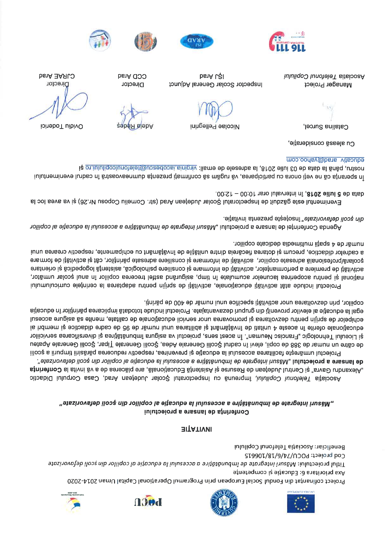 Am plăcerea de a vă invita la lansarea Proiectului „Măsuri integrate de îmbunătățire a accesului la educație al copiilor din școli defavorizate”, eveniment ce va avea loc Joi, 05 iulie 2018, în sala de ședințe a I.Ș.J.Arad, între orele 10.00-12.00. Este vorba despre un proiect POCU /74/6/18/106615, al cărui beneficiar este Asociația „Telefonul copilului”, Inspectoratul Școlar Județean Arad fiind partener, împreună cu Casa Corpului Didactic Arad și Centrul Județean de Resurse și Asistență Educațională Arad.