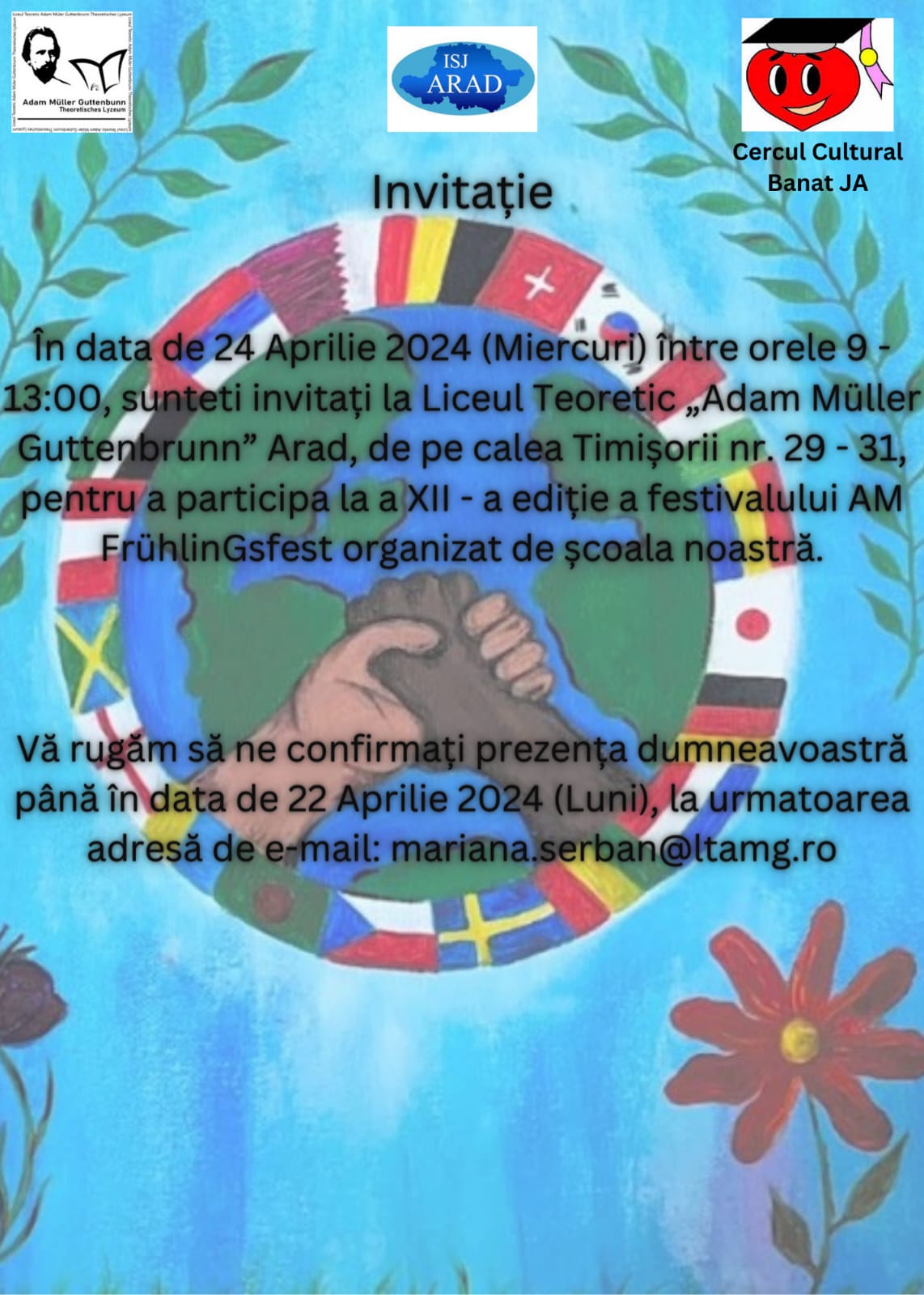 Liceul Teoretic – Theoretisches Lyzeum „Adam Müller Guttenbrunn“ Arad are plăcerea de a vă invita la a doisprezecea ediție a evenimentului << Ziua școlii. Festivalul – concurs „AM FrühlinGsfest” >>. La această ediție vă așteptăm cu standuri tematice realizate de elevii claselor IX-XI, workshop-uri de orientare profesională și în carieră, precum și cu un scurt program artistic.