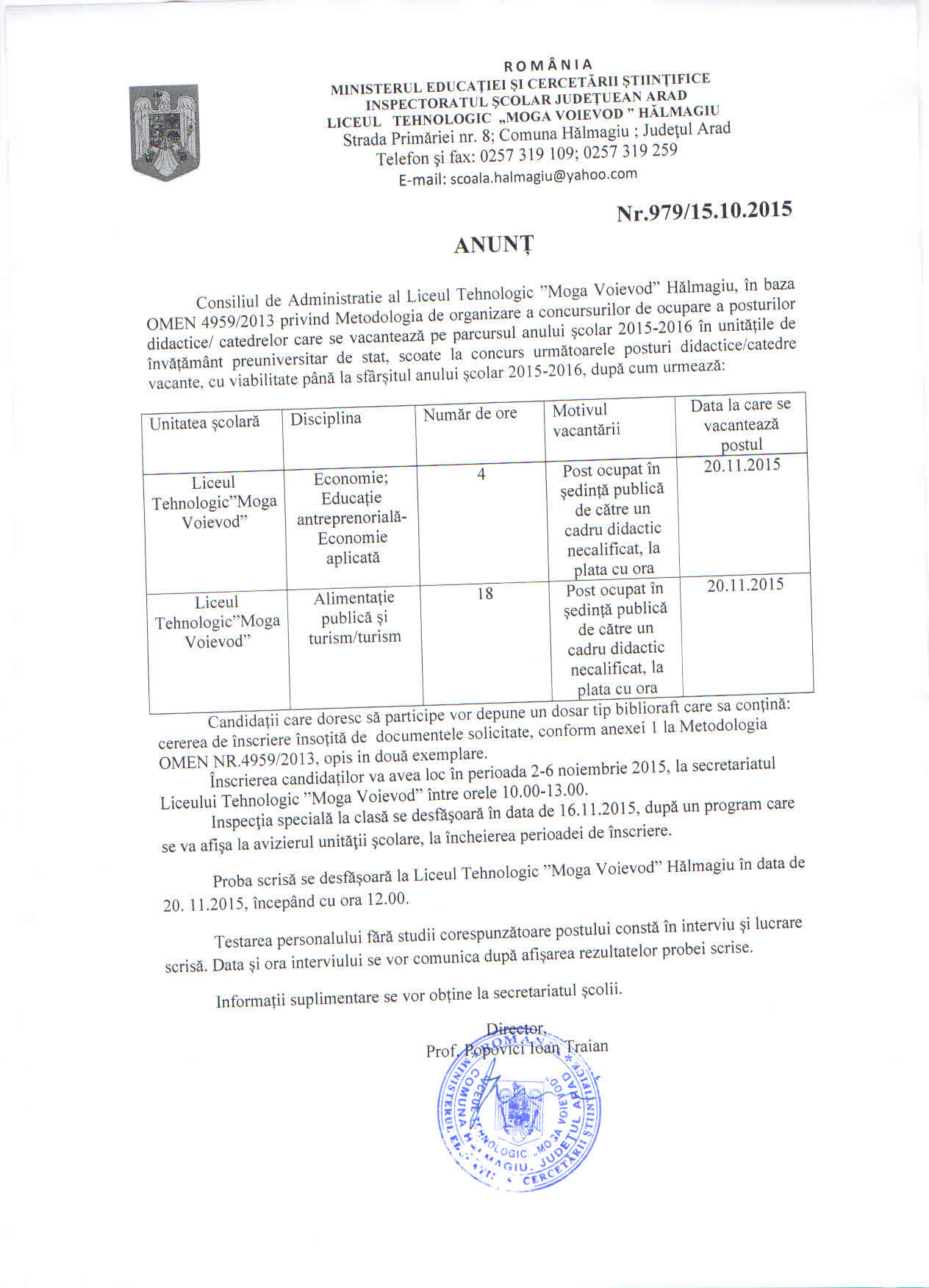 Liceul Tehnologic Moga Voievod Halmagiu organizeaza concurs pentru ocuparea posturilor vacante in timpul anului scolar 2015-2016