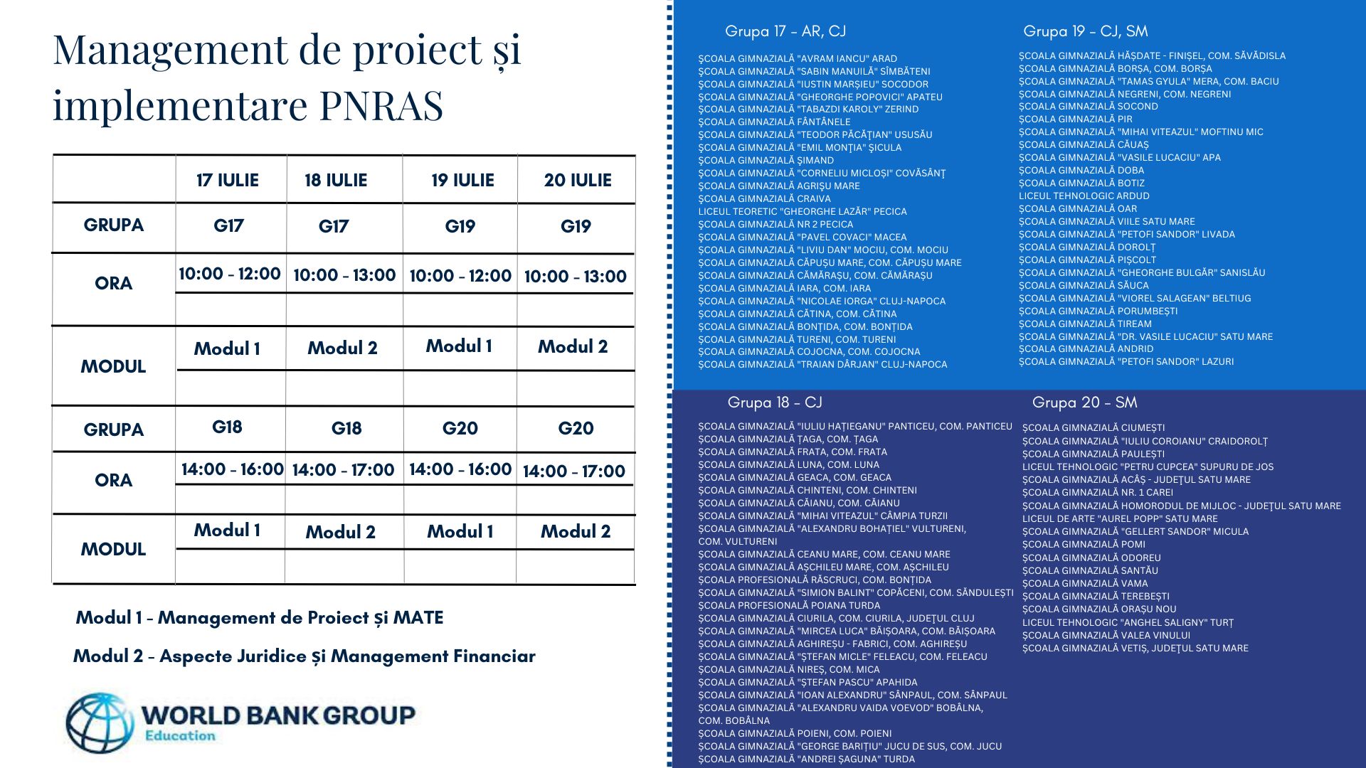 Ministerul Educației și Banca Mondială vă invită să participați la Cursul practic de implementare a granturilor PNRAS care se va desfășura online, luni, 17 iulie 2023, în intervalul 10.00-12.00, pe tema „Management de proiect, metodologia MATE și implementarea activităților PNRAS” și marți, 18 iulie 2023, în intervalul 10:00-13:00, pe tema „Aspecte juridice în implementarea proiectelor PNRAS (achiziții publice și modificări contractuale) și management financiar”.