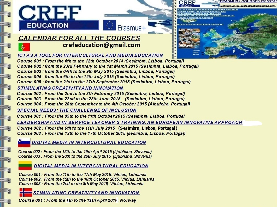 CREF EDUCATION prepared different courses with quality and excellent support, in Portugal, Lithuania, Slovenia and Norway. Attached you can find the confirmed dates. If you are interested on it, just contact us. Thanks for your attention.