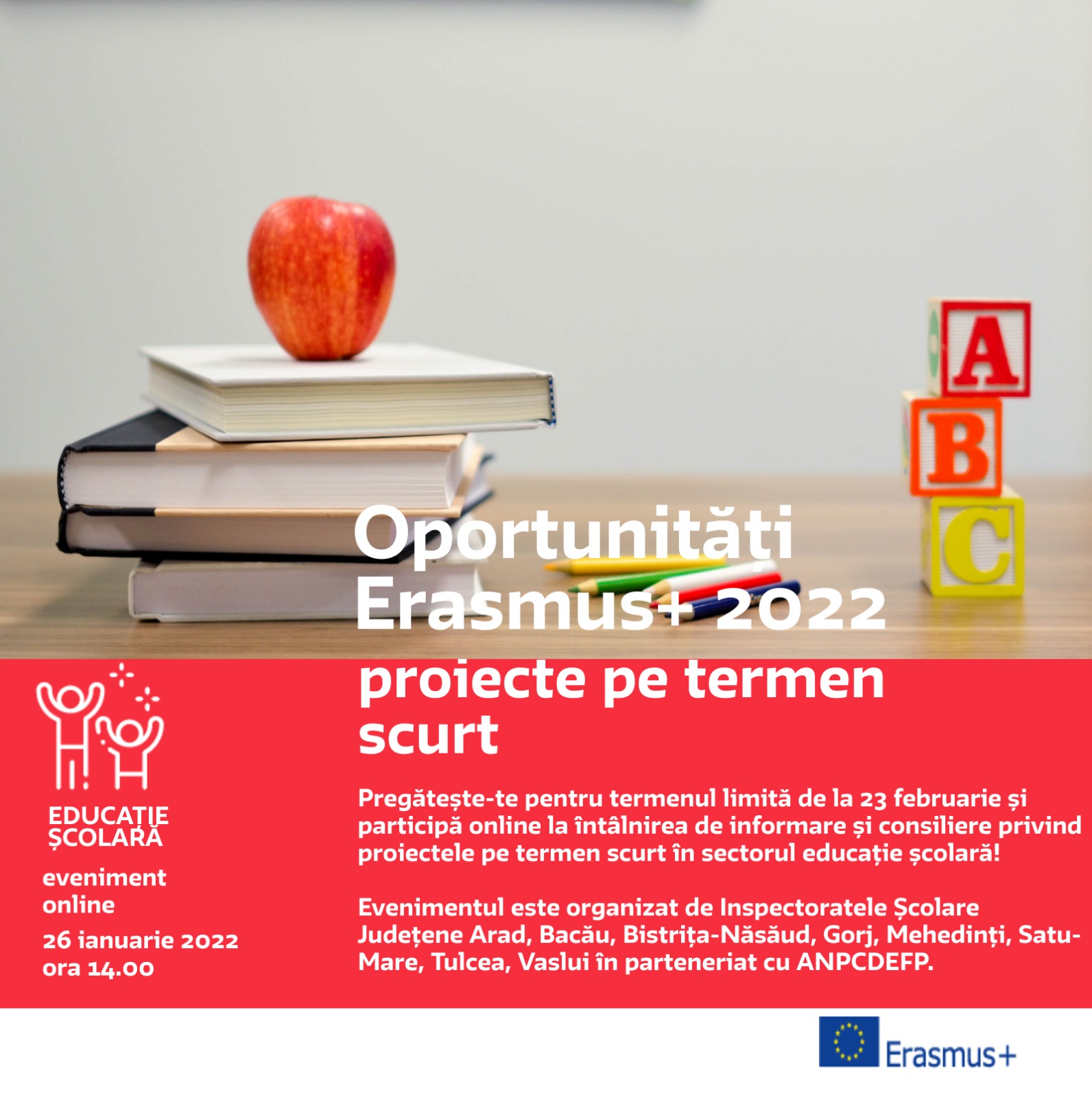 Vă invităm la o întâlnire online organizată de Inspectoratele Școlare Județene Arad, Bacău, Bistrița-Năsăud, Gorj, Mehedinți, Satu-Mare, Tulcea, Vaslui în parteneriat cu ANPCDEFP.